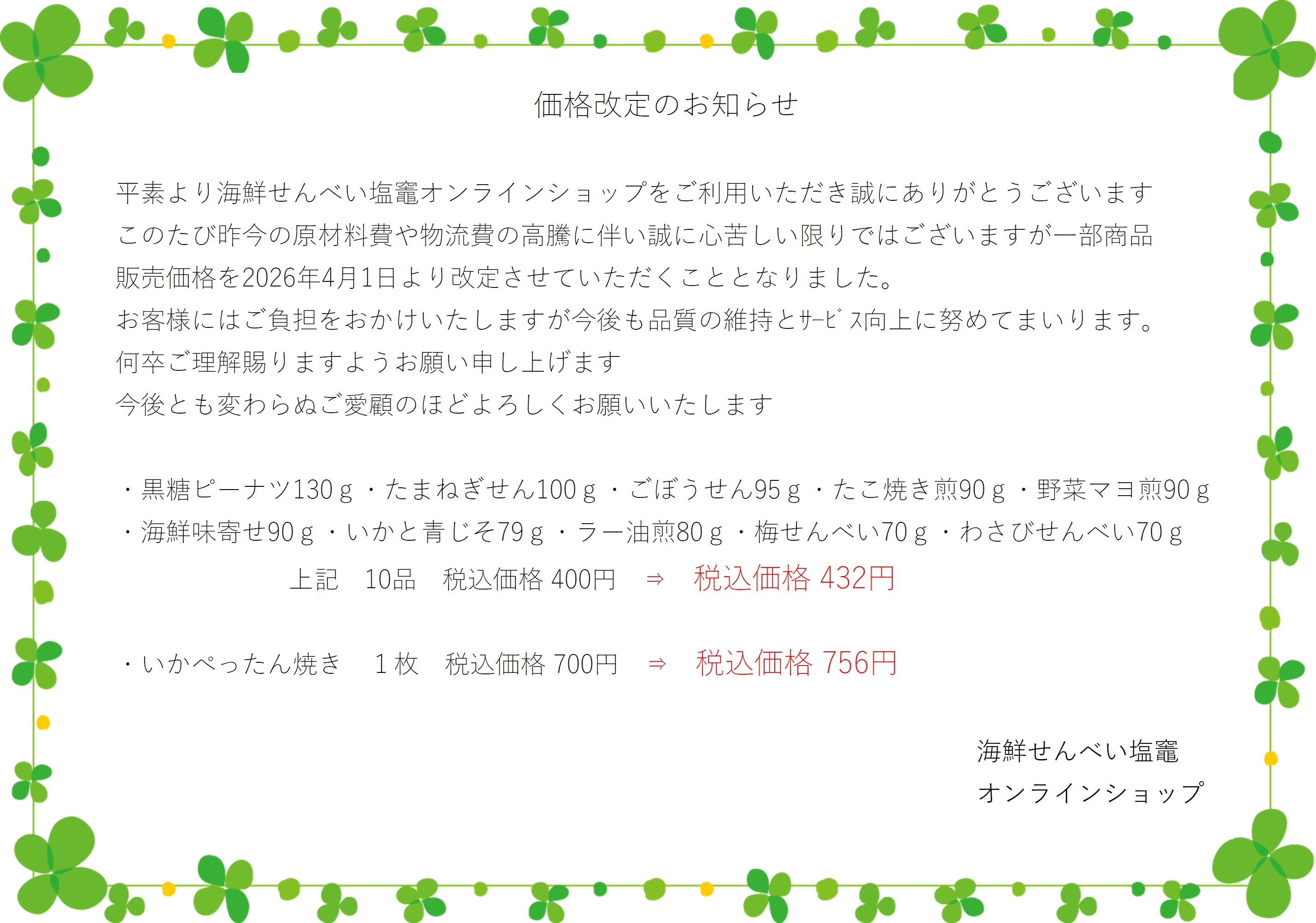 商品価格改定のお知らせ ~4月1日より価格改定となります~